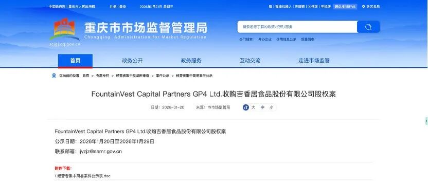 日前,小食代從重慶市市場(chǎng)監(jiān)督管理局官網(wǎng)獲悉,F(xiàn)ountainVest Capital Partners GP4 Ltd.(下稱“方源GP4公司”,為方源資本的實(shí)體之一)收購(gòu)吉香居食品股份有限公司(下稱“吉香居”)股權(quán)案正在進(jìn)行經(jīng)營(yíng)者集中簡(jiǎn)易案件公示。如果交易順利完成,方源資本將持有吉香居92%股份。該案的公示期到2026年1月29日結(jié)束。