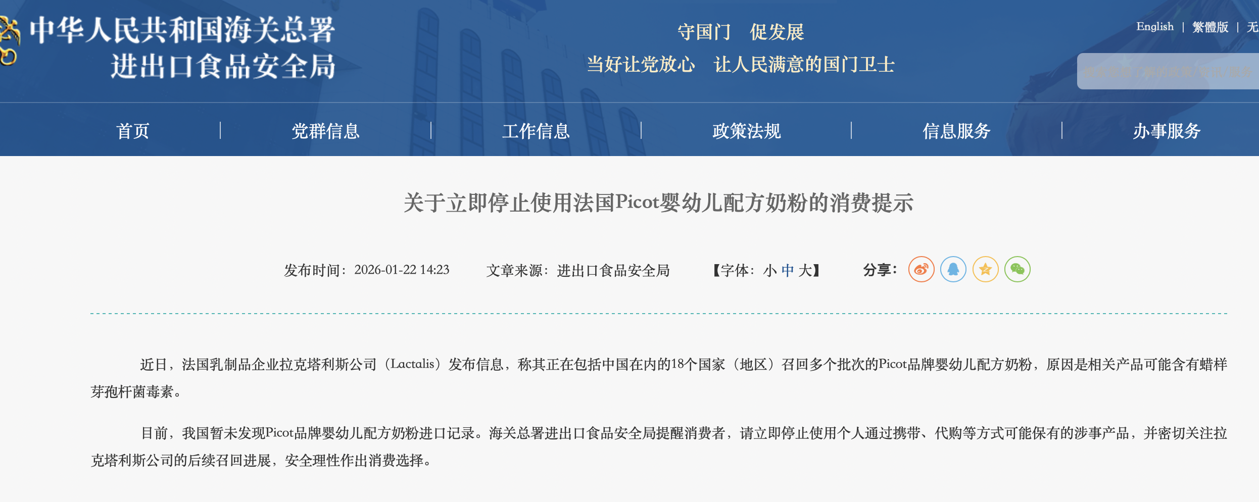 1月22日,海關(guān)總署進(jìn)出口食品安全局發(fā)布消費(fèi)提示稱,目前我國暫未發(fā)現(xiàn)拉克塔利斯旗下召回的Picot品牌嬰幼兒配方奶粉進(jìn)口記錄。該局提醒消費(fèi)者,請立即停止使用個人通過攜帶、代購等方式可能保有的涉事產(chǎn)品,并密切關(guān)注拉克塔利斯公司的后續(xù)召回進(jìn)展,安全理性作出消費(fèi)選擇。