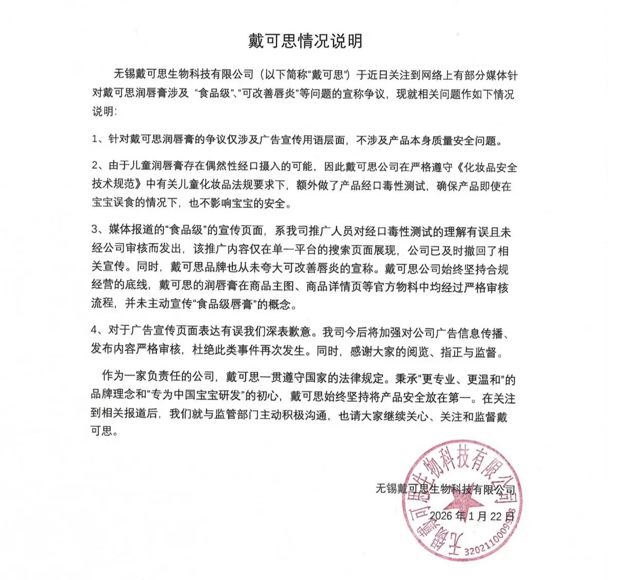 戴可思1月22日發(fā)文稱(chēng),針對(duì)戴可思潤(rùn)唇膏的爭(zhēng)議僅涉及廣告宣傳用語(yǔ)層面,不涉及產(chǎn)品本身質(zhì)量安全問(wèn)題。其稱(chēng),公司在遵守《化妝品安全技術(shù)規(guī)范》中有關(guān)兒童化妝品法規(guī)要求下,額外做了產(chǎn)品經(jīng)口毒性測(cè)試,確保產(chǎn)品即使在寶寶誤食的情況下,不影響寶寶安全。