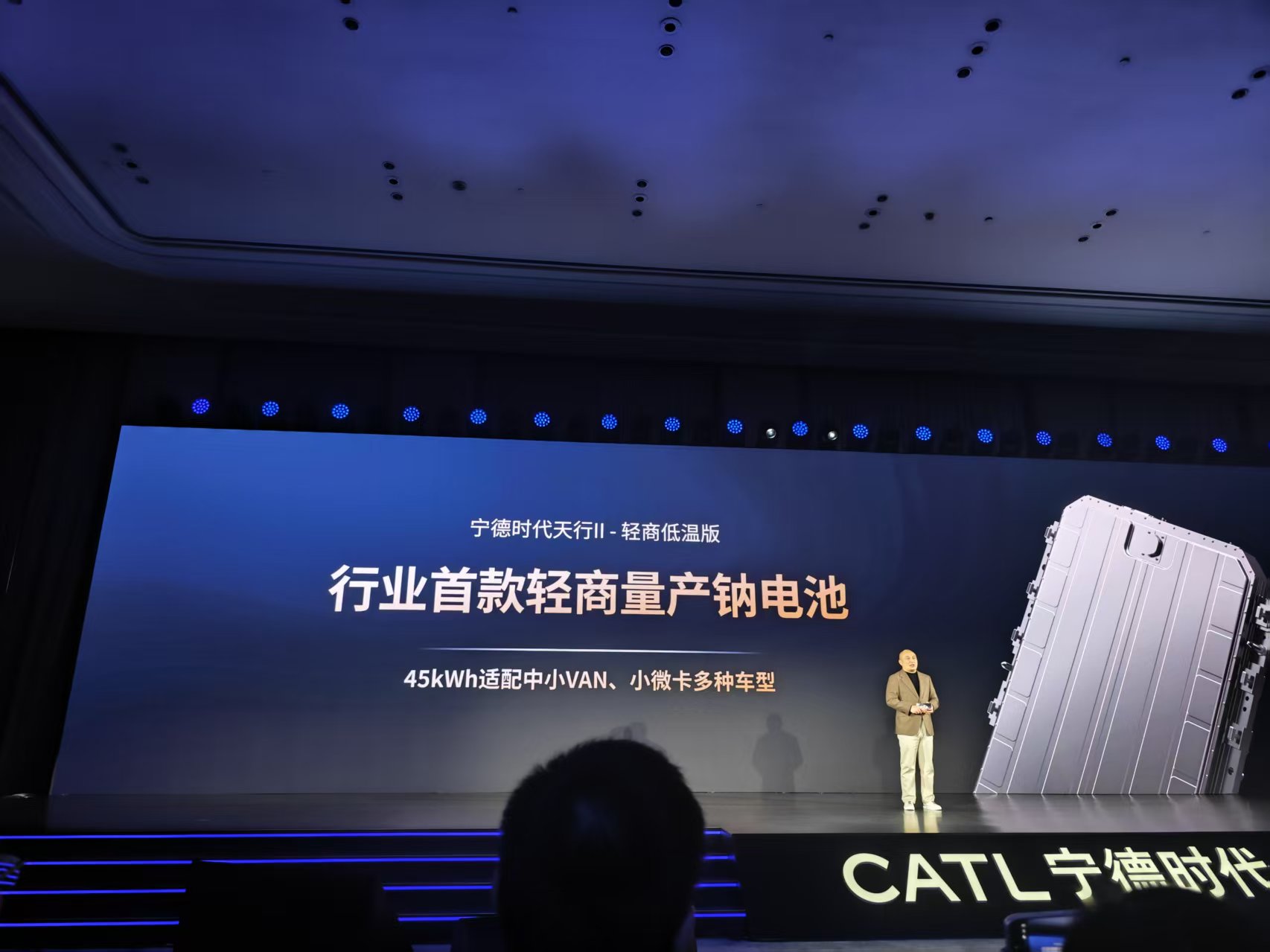 寧德時代還發(fā)布了輕商領(lǐng)域首款量產(chǎn)的鈉離子電池“寧德時代天行II輕商低溫版”,45度電,適用于中小VAN、小微卡等車型。
