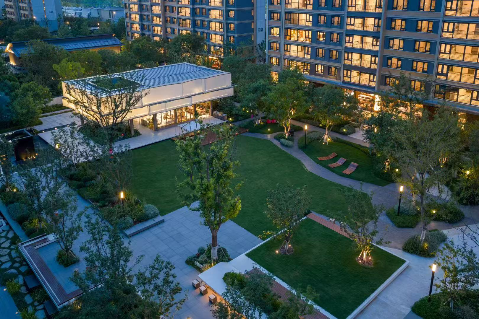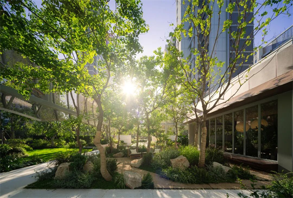 當(dāng)移步至社區(qū)內(nèi)部,由烏桕林組成的儀式庭院,自然生出一種讓人駐足的引力。樹下設(shè)置的休息座位方便業(yè)主在此小坐,抬眼便是烏桕舒展的枝椏與靈動(dòng)的樹影,當(dāng)清風(fēng)拂過,枝葉輕搖,一身疲憊仿佛也隨之消散。