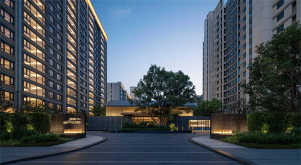 (1)歸家場(chǎng)景層層遞進(jìn),喚醒愉悅情緒從回家路上遠(yuǎn)眺項(xiàng)目,當(dāng)目光觸及環(huán)島落客庭院的外圍界面,就提前從精神上進(jìn)入歸家儀式。由安哥拉黑皮革面花崗巖、電鍍香檳色logo組成的景墻勾勒出社區(qū)的第一道“邊界”;內(nèi)退形成的超尺度落客庭院,院中有水,水中有樹,營(yíng)造出一種既尊貴又充滿自然生機(jī)的氛圍。