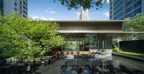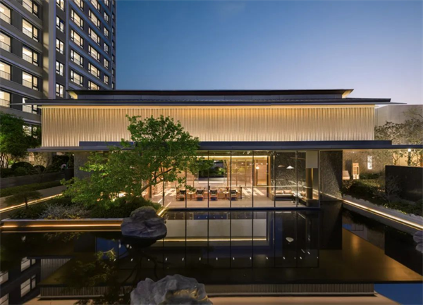 從前廳到中軸再到下沉式的休憩等候區(qū),步移景異,直到透過通透的落地玻璃,將蓮池疊水的美妙景致盡收眼底。這條歸家動(dòng)線深度還原了項(xiàng)目“府邸三進(jìn),進(jìn)門見畫軸”的規(guī)劃場(chǎng)景。