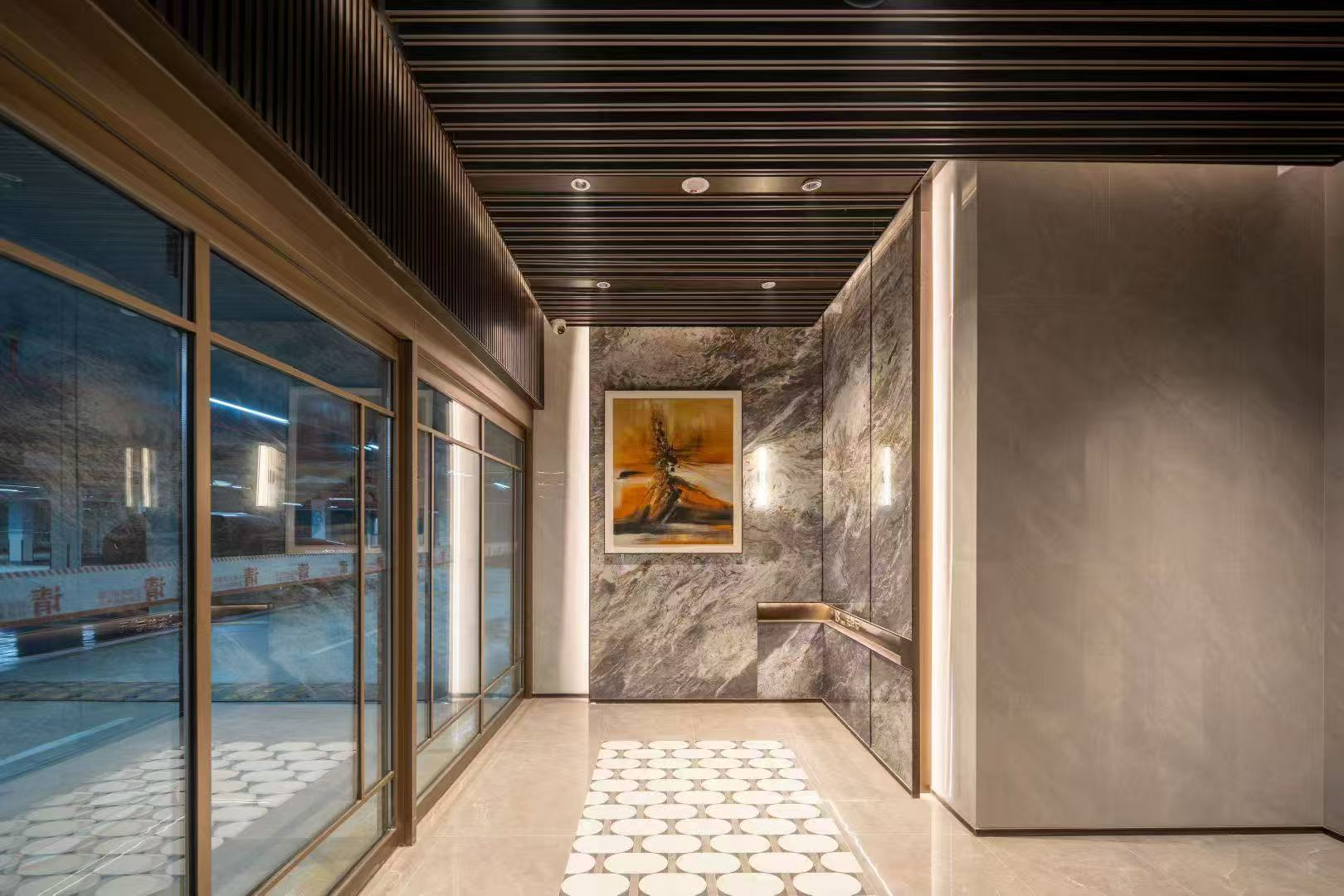 步入酒店化社區(qū)大堂,歸家體驗(yàn)再升級(jí)。社區(qū)大堂挑高約9.5米,檐口采用宇宙黑石材,內(nèi)部鋁鎂錳板+木紋鋁板的碰撞提升了整個(gè)空間的溫度,墨染流云石材地面搭配藝術(shù)格紋夾絲玻璃屏風(fēng),給足了回家的尊崇感。