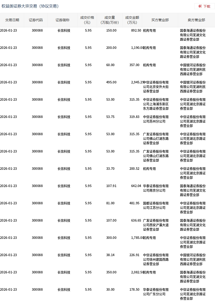 1月23日,長(zhǎng)信科技大宗交易成交2165.5萬股,成交額1.29億元,占當(dāng)日總成交額的5.73%,成交價(jià)5.95元,較市場(chǎng)收盤價(jià)7.04元折價(jià)15.48%。