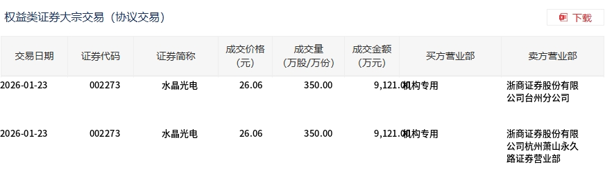 1月23日,水晶光電大宗交易成交700萬股,成交額1.82億元,占當日總成交額的11.33%,成交價26.06元,較市場收盤價26.32元折價0.99%。