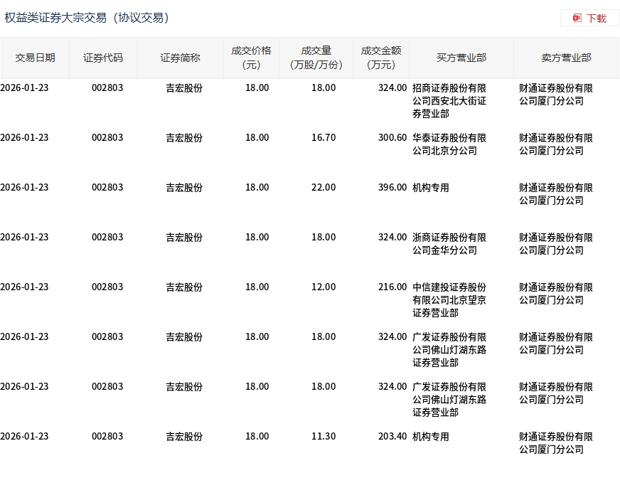 1月23日,吉宏股份大宗交易成交134萬股,成交額2412萬元,占當(dāng)日總成交額的6.23%,成交價(jià)18元,較市場(chǎng)收盤價(jià)20.4元折價(jià)11.76%。