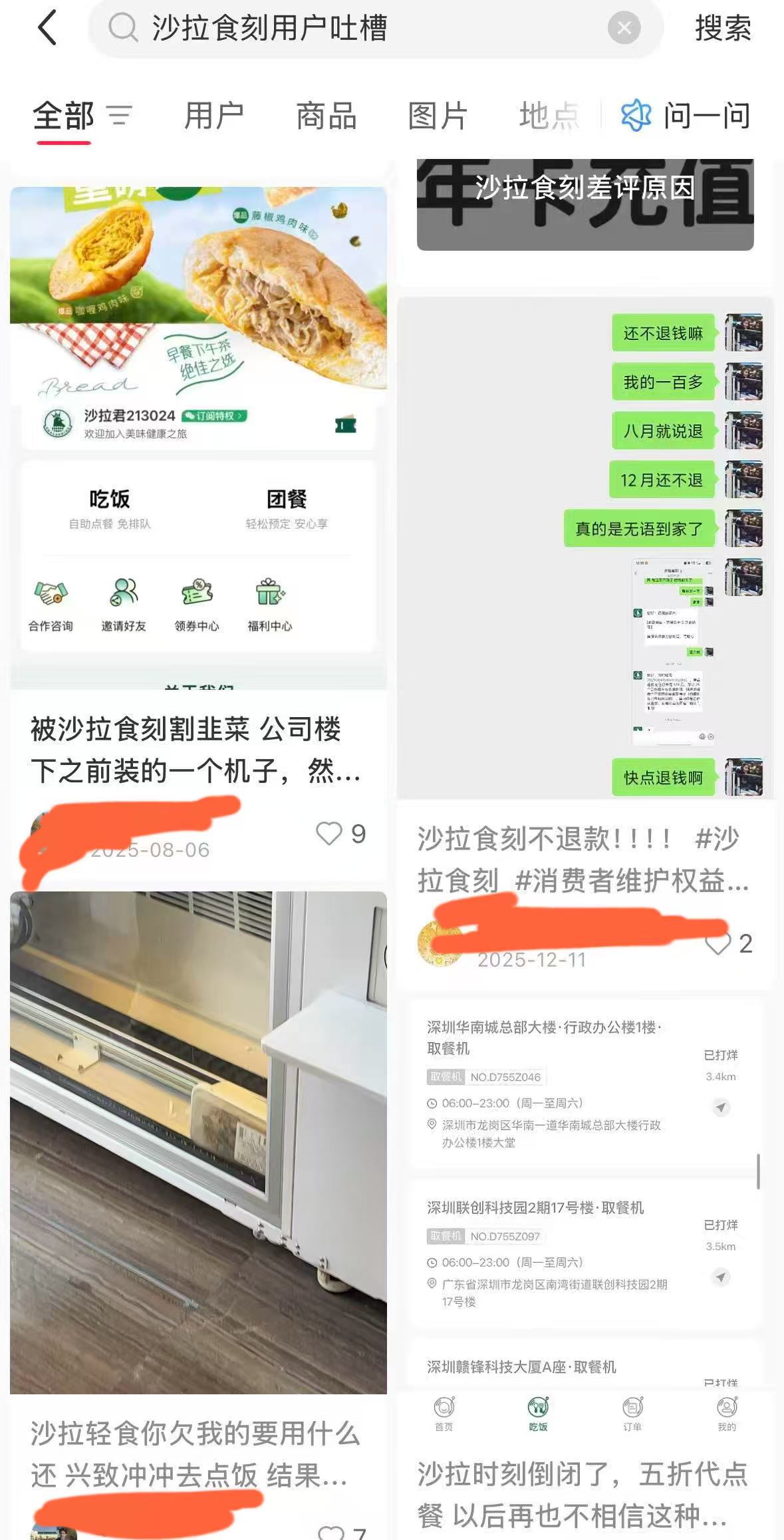 1月23日,界面新聞查詢社交平臺,發(fā)現(xiàn)從去年年中開始,就有人發(fā)帖稱購買了沙拉食刻的儲值卡,但申請退款不到賬、也聯(lián)系不到客服;還有人寫了被“割韭菜”經(jīng)歷:去年公司樓下裝了取餐機,5月份工作人員說機器壞了,但3個多月都沒修好,才想到里面還有充值的錢,下面50多條評論中有的說“我幸好用完了”、“一個多月退款都沒有到賬”。沙拉食刻自己的小程序評分只有2.6,也有不少用戶留言反映撤機、退不了款的情況。