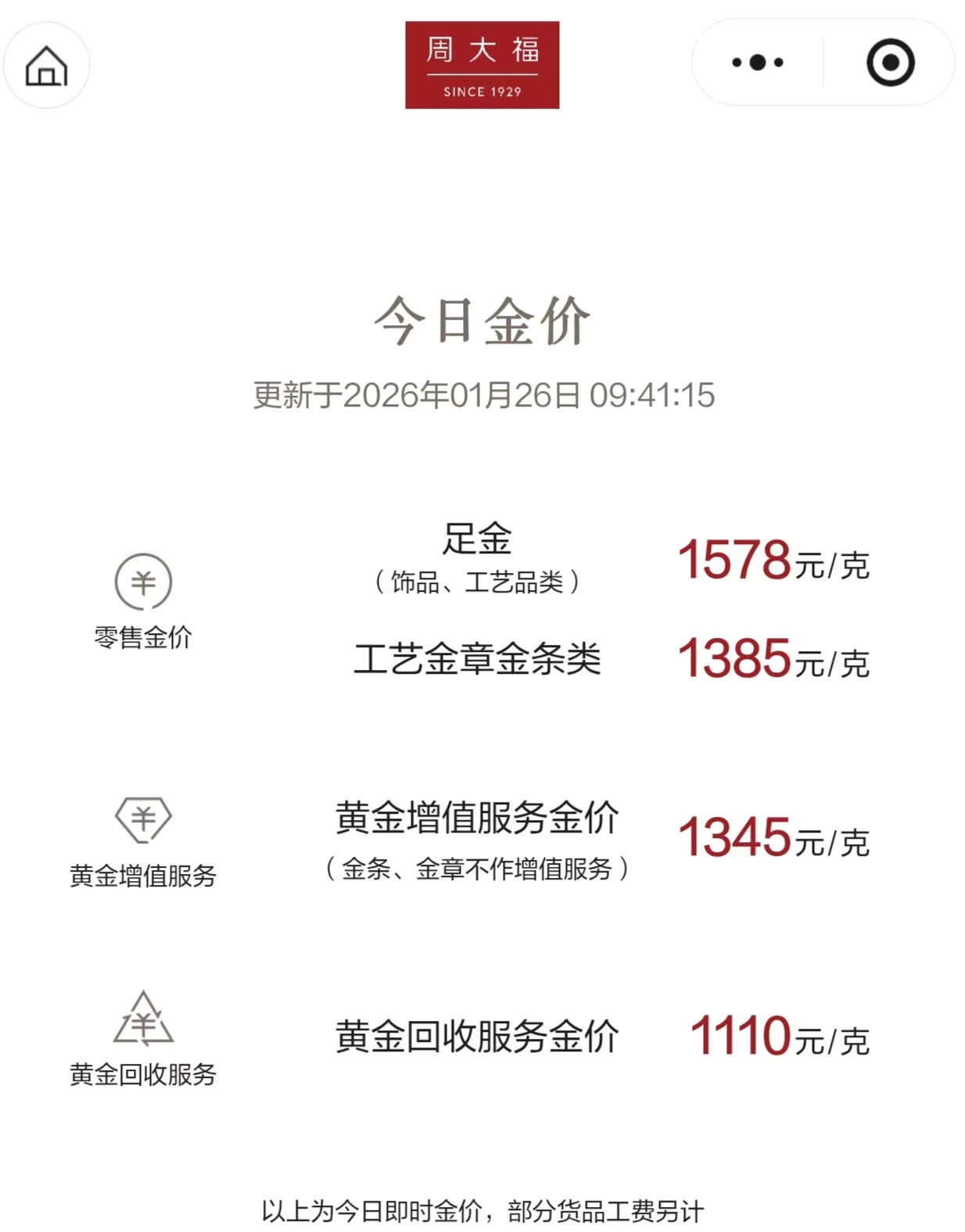 1月26日,國內(nèi)多家品牌的黃金飾品克價(jià)升至1570元以上。