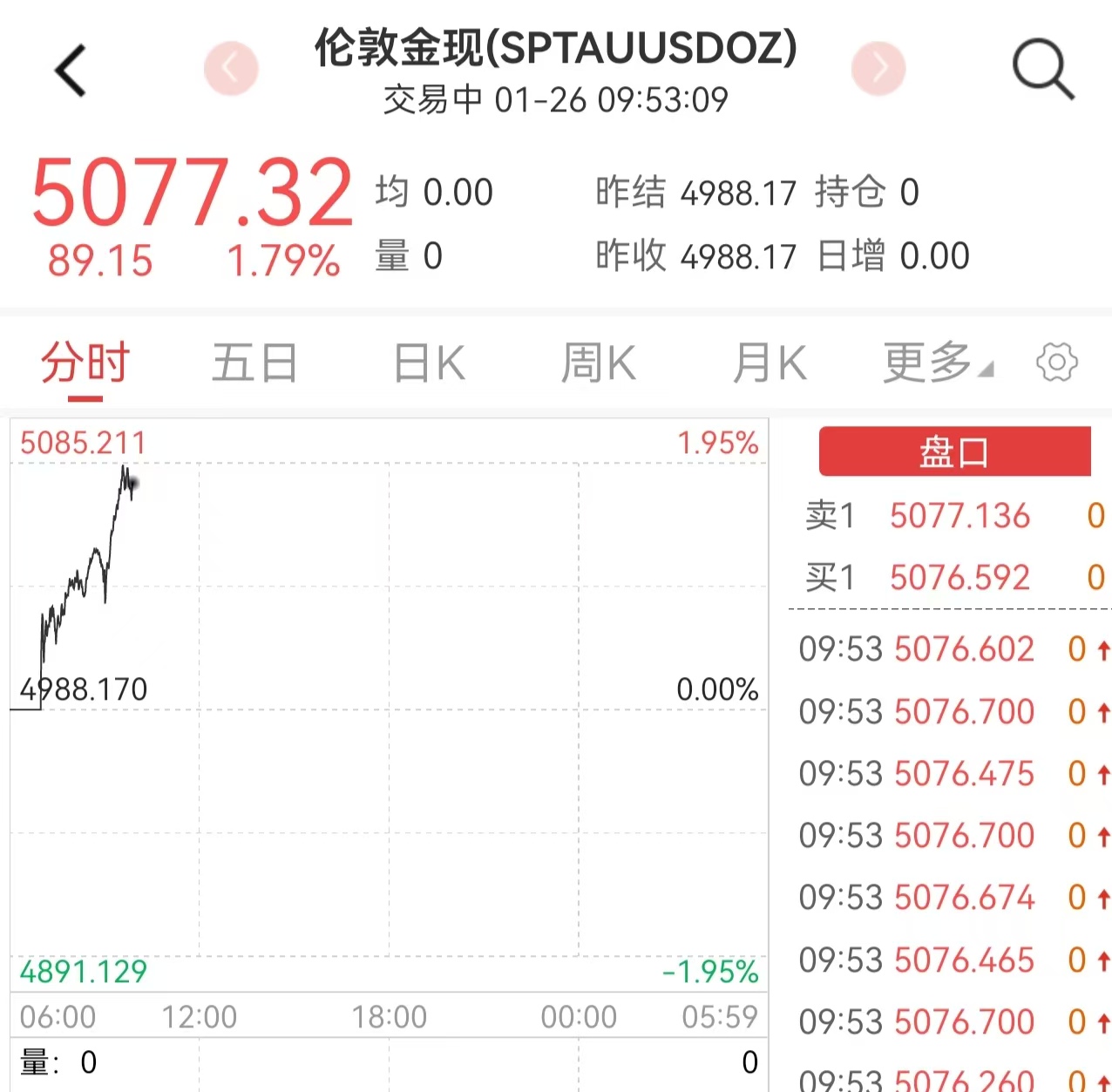 黃金市場迎來歷史性時(shí)刻,現(xiàn)貨價(jià)格和期貨價(jià)格均首次突破5000美元/盎司。截至1月26日發(fā)稿前,COMEX黃金期貨價(jià)格報(bào)5073.4美元/盎司,漲幅達(dá)1.88%;倫敦黃金現(xiàn)貨報(bào)5077.32美元/盎司,漲幅達(dá)1.79%。