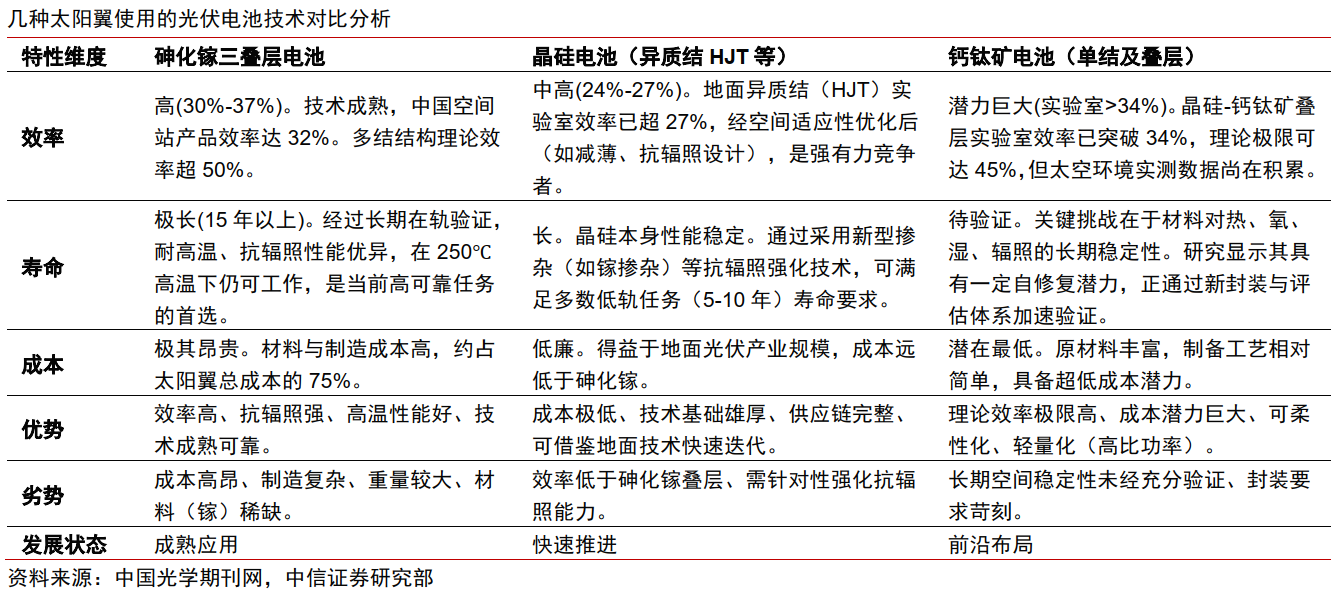 中信建投同樣認(rèn)為,HJT電池在現(xiàn)有量產(chǎn)技術(shù)中抗輻射、輕量化優(yōu)勢最明顯,2026年后滲透率預(yù)計將有所提升,并以執(zhí)行低軌短期低成本低功率任務(wù)為主。鈣鈦礦及疊層電池有望憑借高比功率、抗輻射優(yōu)勢,在2028年后將逐步承擔(dān)低軌星座及深空探測任務(wù)。
