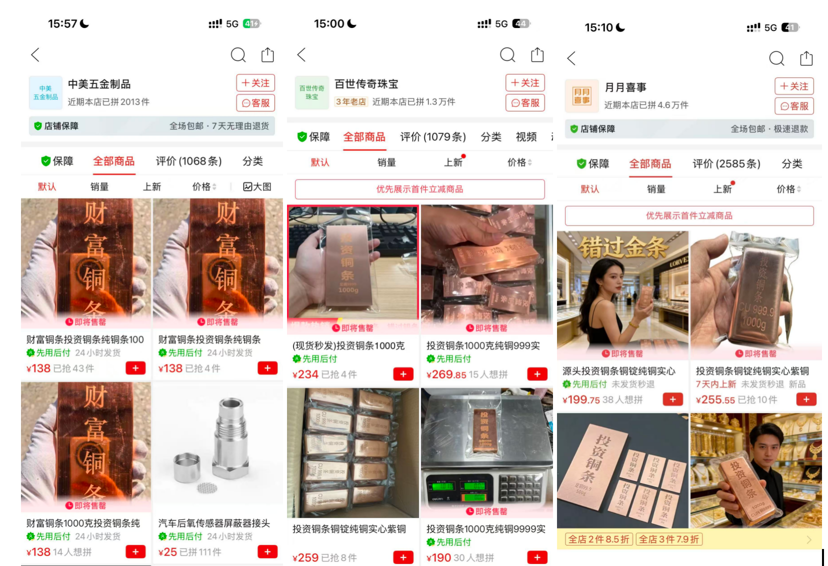 “投資銅條”現(xiàn)身淘寶、閑魚、拼多多