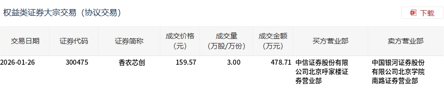 1月26日,香農(nóng)芯創(chuàng)大宗交易成交3萬股,成交額478.71萬元,占當(dāng)日總成交額的0.08%,成交價159.57元,較市場收盤價162.83元折價2%。