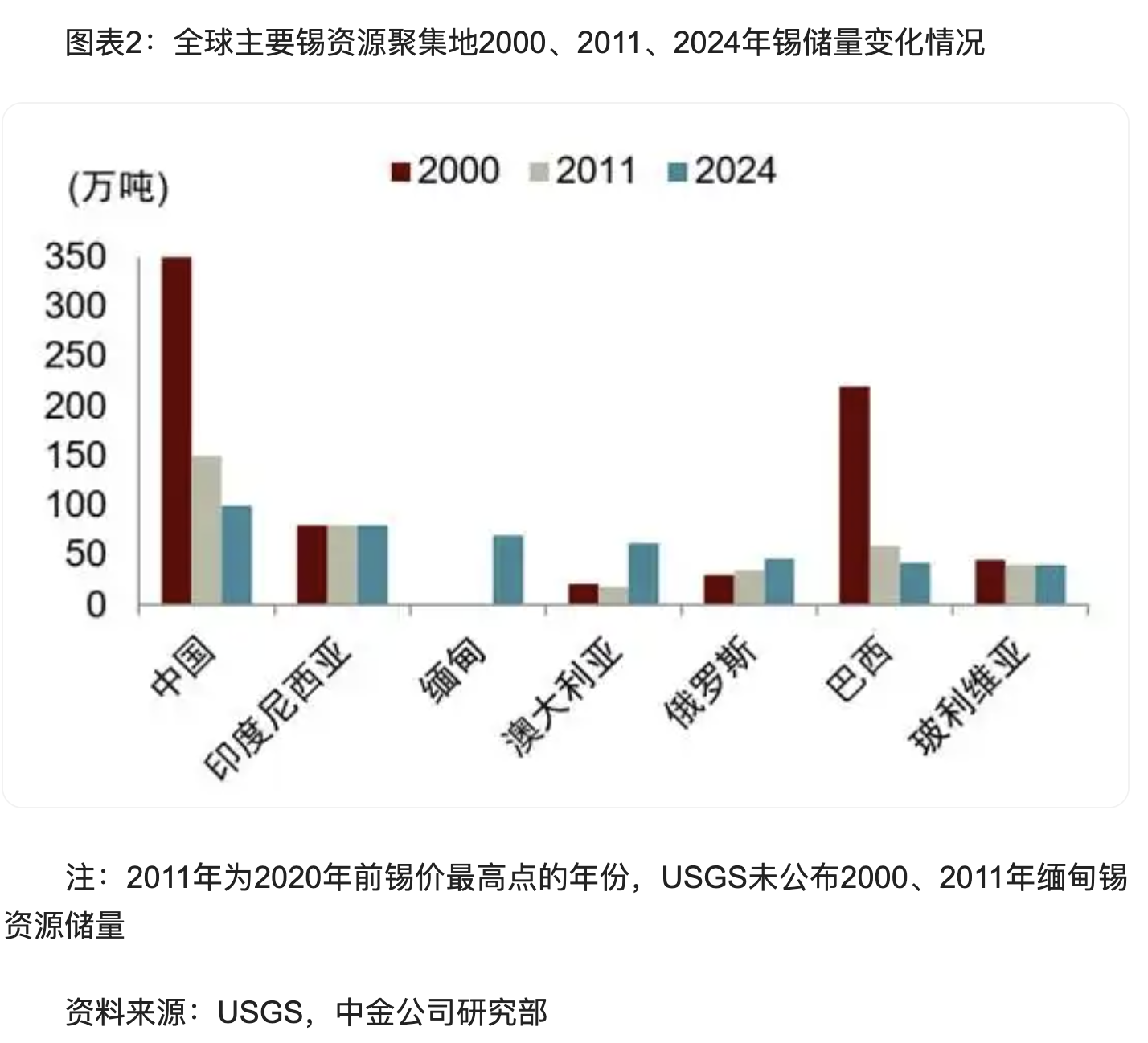 中國是全球最大的錫資源儲量國和產(chǎn)量國。從全球資源格局看,錫資源主要分布在中國、印度尼西亞、巴西、玻利維亞、澳大利亞,五國錫儲量超過全球總儲量的70%。