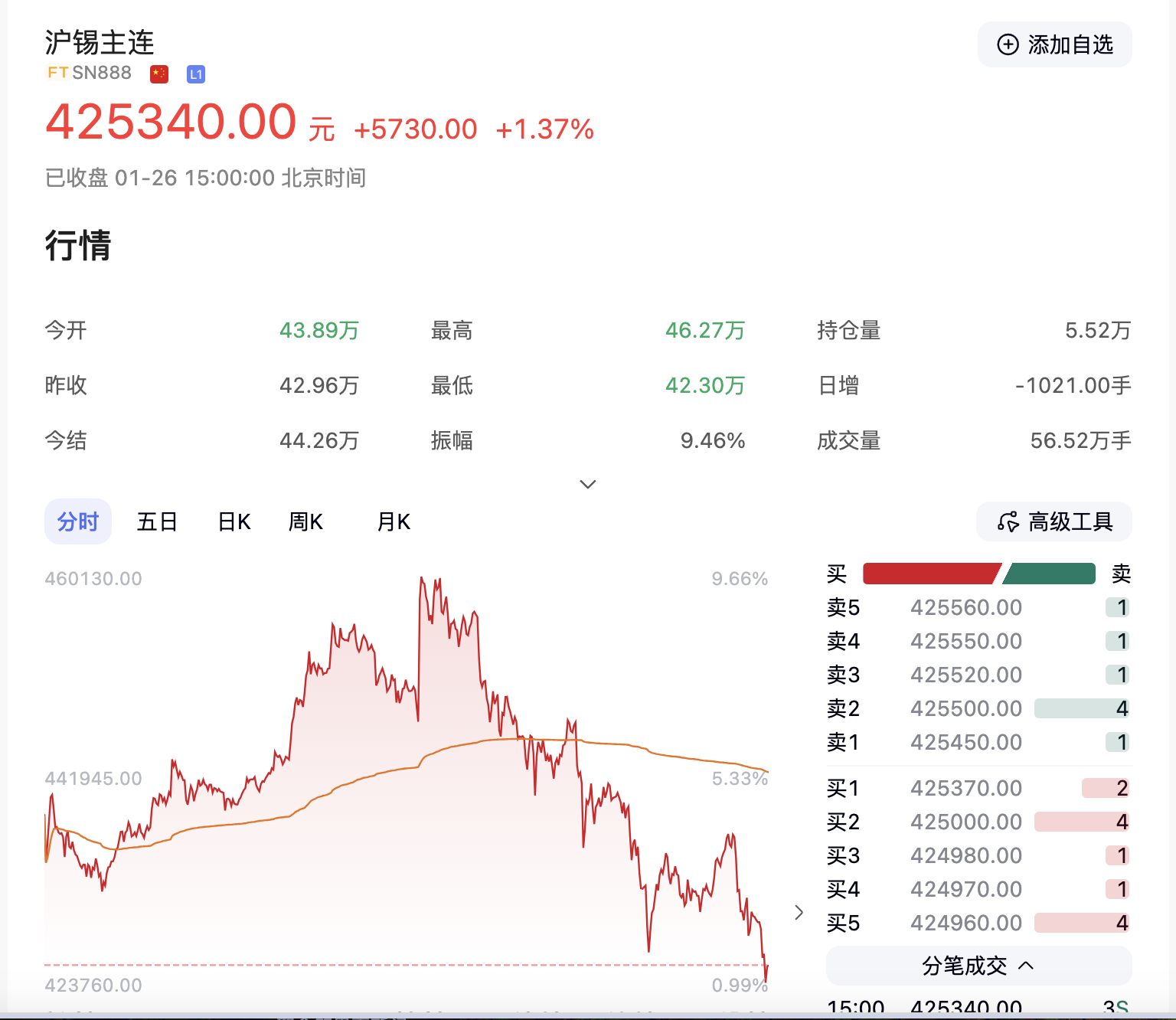1月26日,滬錫期貨主力合約一度漲超10%,報約46.27萬元/噸。截至當(dāng)天收盤,報42.53萬元/噸,較前一交易日上漲1.37%,月內(nèi)漲幅超25%。