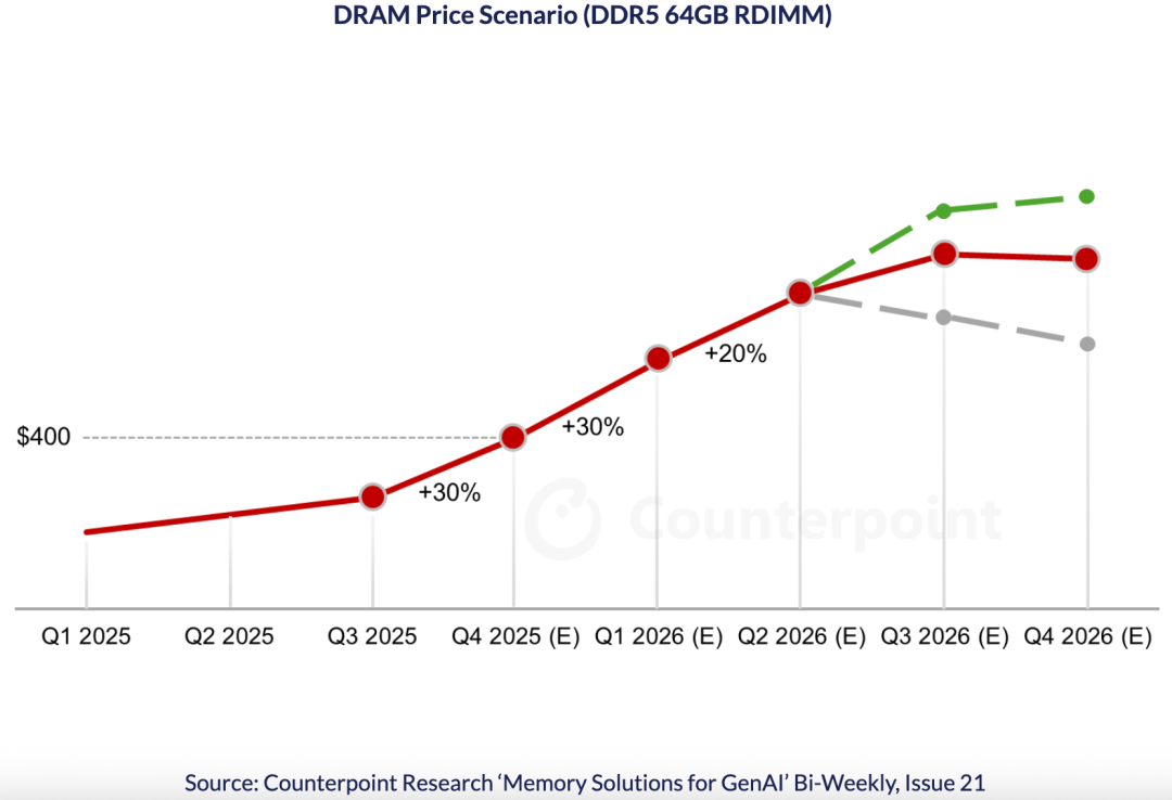 Counterpoint預(yù)計(jì),2026年第一季度內(nèi)存價(jià)格將進(jìn)一步上漲40%-50%,第二季度還將上漲約20%。
