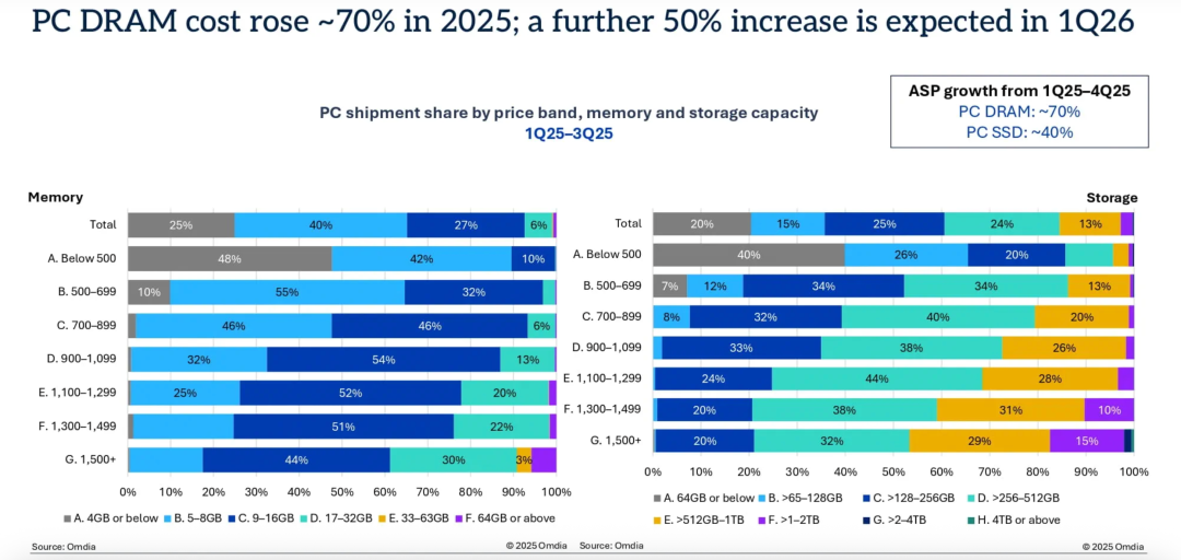 市場數(shù)據(jù)顯示,2025年第一季度至第四季度,主流PC內(nèi)存和存儲(chǔ)設(shè)備的成本上漲了40%至70%。
