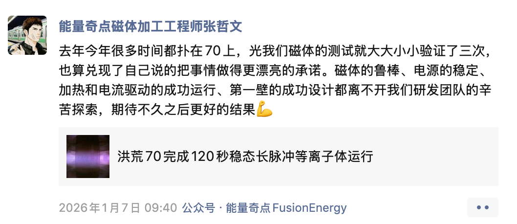 他所說(shuō)的“70”,是指能量奇點(diǎn)自主研發(fā)建造的高溫托卡馬克裝置洪荒70。