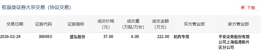 2月24日,盛弘股份大宗交易成交6萬股,成交額222萬元,占當(dāng)日總成交額的0.98%,成交價37元,較市場收盤價39.26元折價5.76%。
