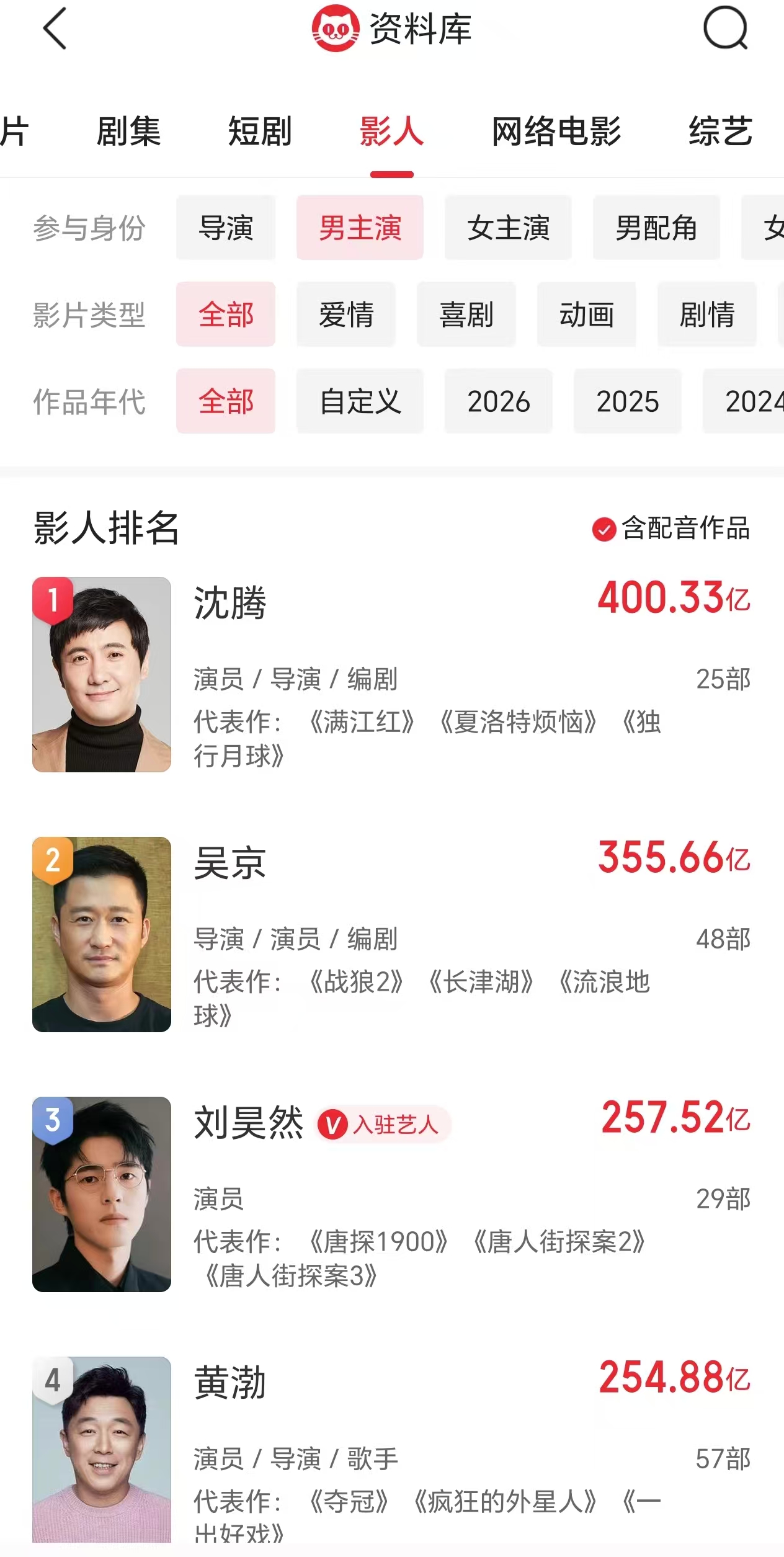 此前沈騰主演的電影《你好,李煥英》票房54.13億元《滿江紅》票房45.44億元,《飛馳人生2》票房33.61億元,《抓娃娃》票房33.27億元,《獨(dú)行月球》票房31.03億元,《我和我的家鄉(xiāng)》票房28.29億元,《西虹市首富》票房25.47億元等。