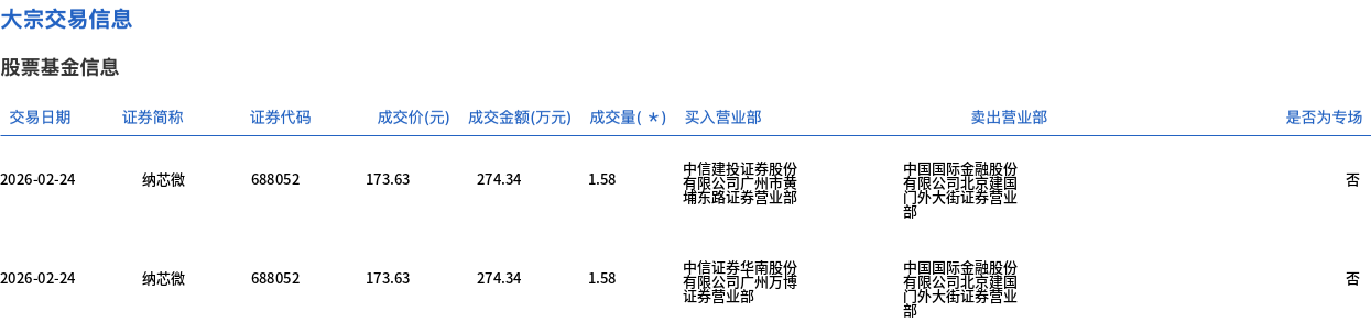 2月24日,納芯微大宗交易成交3.16萬股,成交額548.68萬元,占當日總成交額的1.29%,成交價173.63元,較市場收盤價173.63元持平。