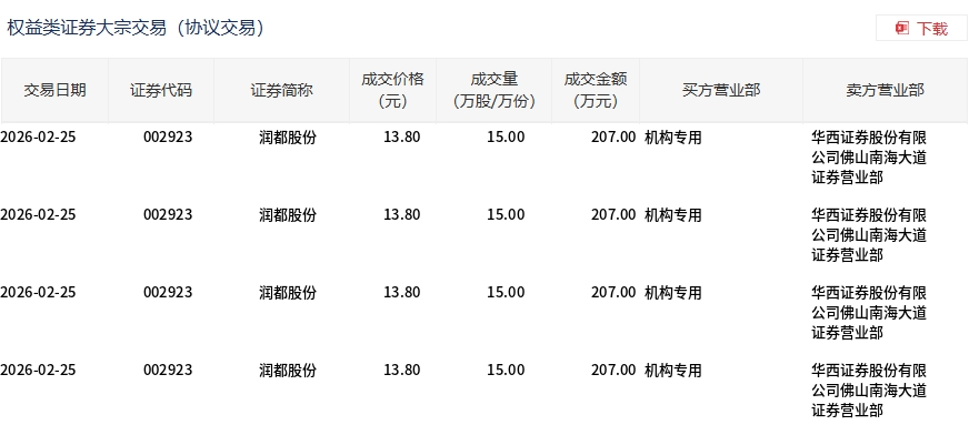 2月25日,潤(rùn)都股份大宗交易成交60萬(wàn)股,成交額828萬(wàn)元,占當(dāng)日總成交額的7.1%,成交價(jià)13.8元,較市場(chǎng)收盤(pán)價(jià)15.49元折價(jià)10.91%。