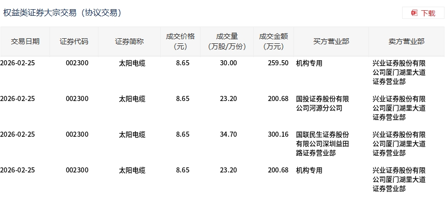 2月25日,太陽(yáng)電纜大宗交易成交111.1萬(wàn)股,成交額961.02萬(wàn)元,占當(dāng)日總成交額的2.05%,成交價(jià)8.65元,較市場(chǎng)收盤價(jià)9.65元折價(jià)10.36%。