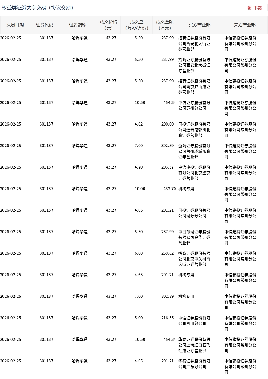 2月25日,哈焊華通大宗交易成交101.27萬股,成交額4382.09萬元,占當(dāng)日總成交額的8.9%,成交價43.27元,較市場收盤價53.33元折價18.86%。