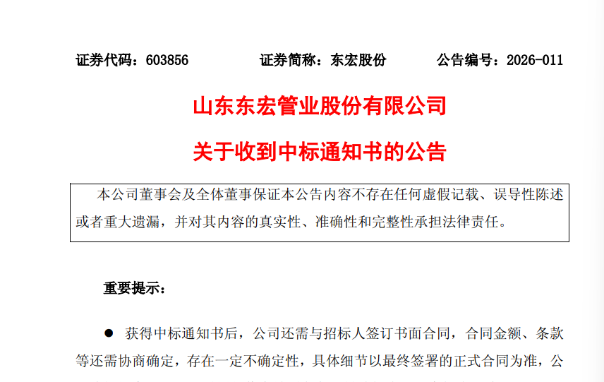 2月24日,山東東宏管業(yè)股份有限公司(代碼:603856;簡稱:東宏股份)披露關(guān)于收到中標(biāo)通知書的公告。根據(jù)公告,東宏股份中標(biāo)某工程壓力鋼管及配件采購項目,中標(biāo)金額達3.53億元。