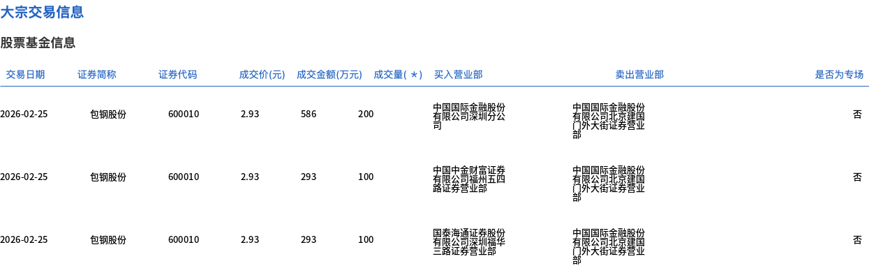 2月25日,包鋼股份大宗交易成交400萬股,成交額1172萬元,占當(dāng)日總成交額的0.2%,成交價(jià)2.93元,較市場收盤價(jià)2.93元持平。