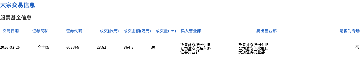 2月25日,今世緣大宗交易成交40萬股,成交額1152.4萬元,占當日總成交額的8.64%,成交價28.81元,較市場收盤價32.07元折價10.17%。