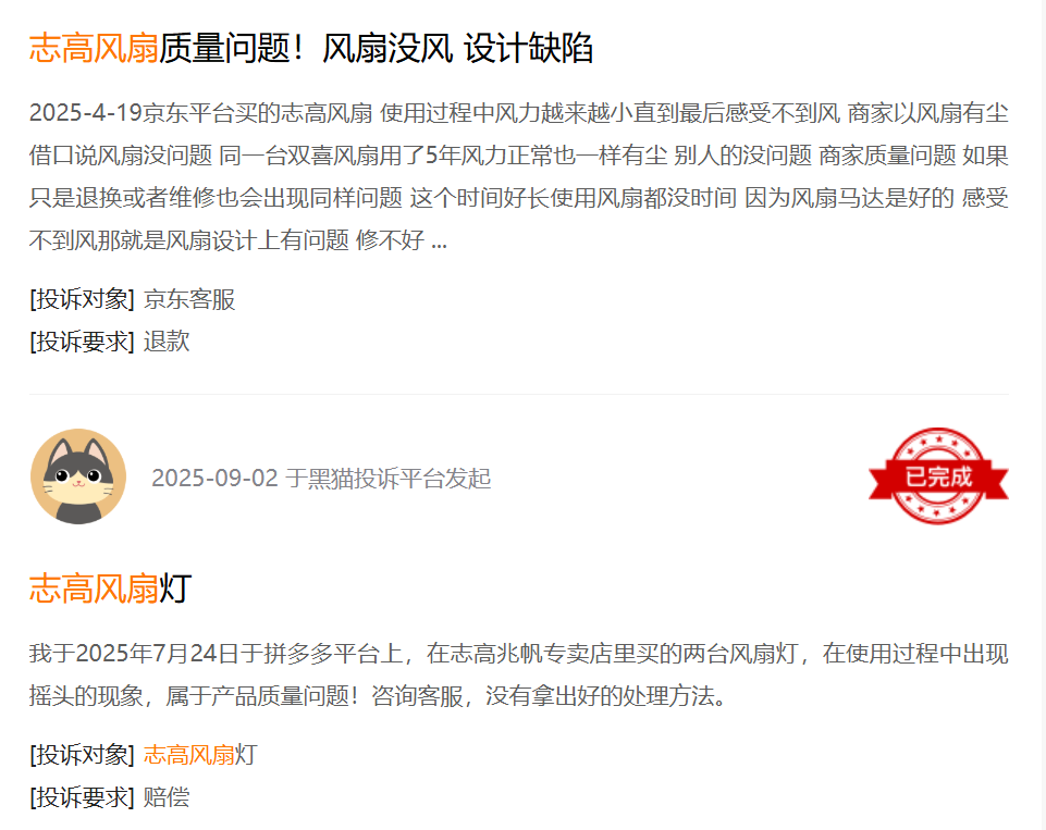 另一方面,“新志高”雖然只聚焦于空調(diào)業(yè)務(wù),但“志高”仍然是歷史債務(wù)的“殼”。過(guò)去,公司將“志高系”商標(biāo)授權(quán)給若干家電小廠,在黑貓投訴平臺(tái)上,這些小家電質(zhì)量問(wèn)題頻出,也在進(jìn)一步稀釋“新志高”的品牌公信力 。