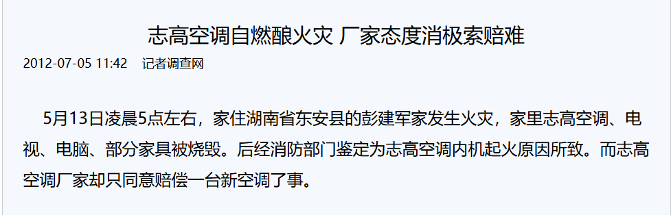 在這幾年,志高空調(diào)也不止一次出現(xiàn)自燃起火事件等。至今,在黑貓投訴平臺(tái)上,仍有不少消費(fèi)者投訴志高空調(diào)不能制冷/制暖、售后服務(wù)差等。