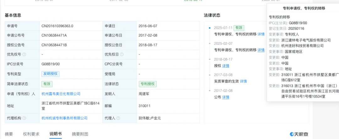 天眼查顯示,這項“電子狗”專利最初為浙江建林電子電氣股份有限公司(下稱“建林電氣”)持有。2025年2月7日,建林電氣將該專利轉(zhuǎn)讓給杭州連好科技貿(mào)易有限公司,7月11日,連好科技又轉(zhuǎn)讓給如今的露韋美。