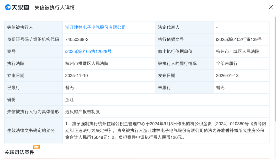 并且,建林電氣歷史上12次成為被執(zhí)行人,6次被列為限制高消費企業(yè)。2026年1月,建林電氣因補(bǔ)繳所欠住房公積金合計1.5萬元,再次成為失信被執(zhí)行人。
