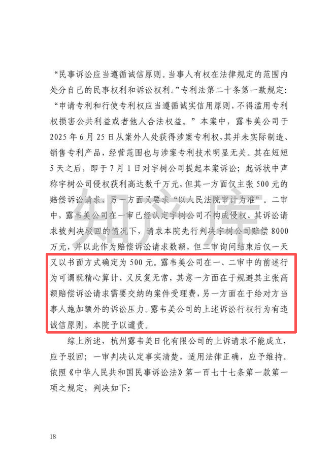 最高人民法院在二審中指出,露韋美公司于2025年6月25日獲得專利后未實際制造、銷售專利產(chǎn)品,經(jīng)營范圍與專利技術(shù)無關(guān),在短短5天之后,即向宇樹科技提起訴訟。其在一審中主張500元賠償卻要求審計,二審中先提出8000萬元賠償并申請先行賠付,次日又調(diào)回500元,行為 “既精心算計、又反復(fù)無?!?,實則是為規(guī)避訴訟費、向宇樹科技施加額外訴訟壓力,該行為違反誠信原則,法院予以譴責(zé)。