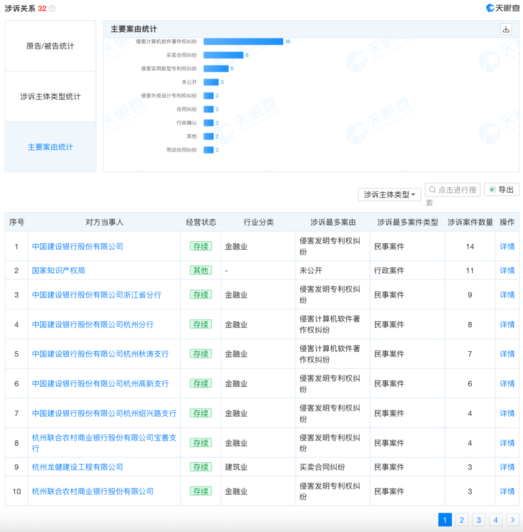 進(jìn)一步分析,建林電氣起訴的銀行多達(dá)20家,包括中國建設(shè)銀行、以及建設(shè)銀行在杭州、上海、北京的多個分行、支行,例如中國建設(shè)銀行杭州西湖支行、中國建設(shè)銀行杭州蕭山支行、中國建設(shè)銀行杭州高新支行等,以及浙江蕭山農(nóng)村商業(yè)銀行、杭州聯(lián)合農(nóng)村商業(yè)銀行文新支行等。起訴理由均為侵害發(fā)明專利權(quán)糾紛或侵害計算機(jī)軟件著作權(quán)糾紛。