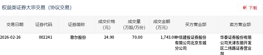 2月26日,歌爾股份大宗交易成交70萬股,成交額1743萬元,占當(dāng)日總成交額的0.7%,成交價(jià)24.9元,較市場(chǎng)收盤價(jià)27.08元折價(jià)8.05%。