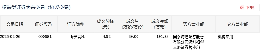 2月26日,山子高科大宗交易成交39萬(wàn)股,成交額191.88萬(wàn)元,占當(dāng)日總成交額的0.07%,成交價(jià)4.92元,較市場(chǎng)收盤(pán)價(jià)4.92元持平。