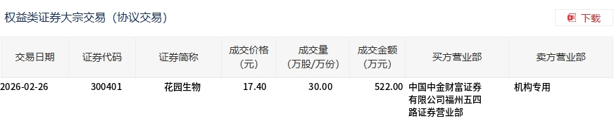 2月26日,花園生物大宗交易成交30萬(wàn)股,成交額522萬(wàn)元,占當(dāng)日總成交額的1.25%,成交價(jià)17.4元,較市場(chǎng)收盤(pán)價(jià)17.4元持平。