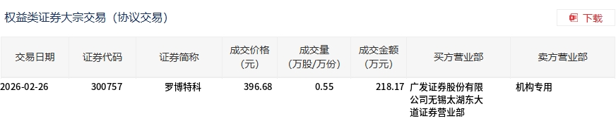2月26日,羅博特科大宗交易成交5500股,成交額218.17萬元,占當日總成交額的0.06%,成交價396.68元,較市場收盤價396.68元持平。