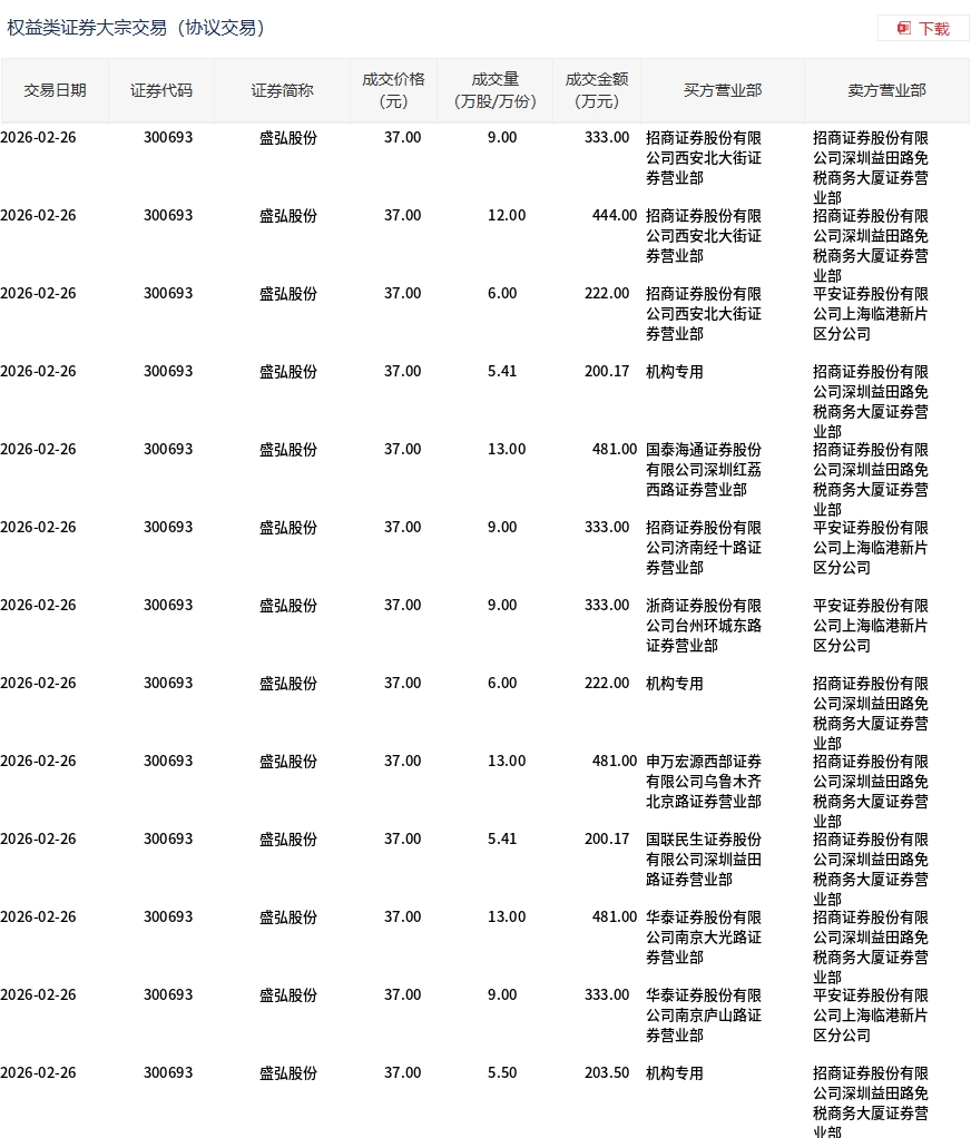 2月26日,盛弘股份大宗交易成交115.32萬(wàn)股,成交額4266.84萬(wàn)元,占當(dāng)日總成交額的8.37%,成交價(jià)37元,較市場(chǎng)收盤價(jià)40.04元折價(jià)7.59%。