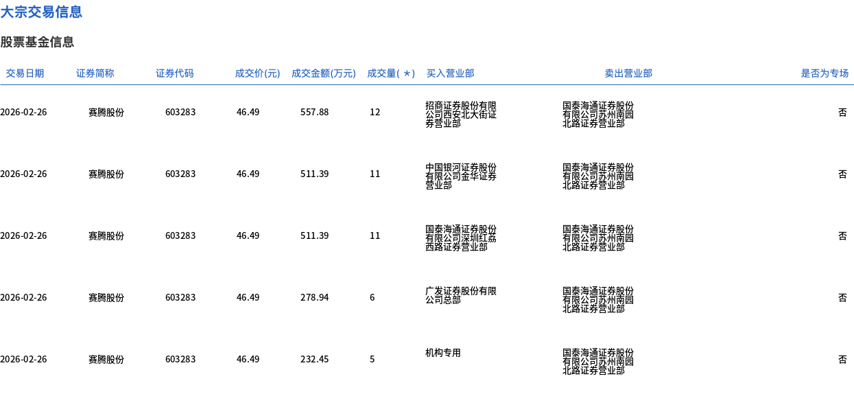 2月26日,賽騰股份大宗交易成交45萬股,成交額2092.05萬元,占當(dāng)日總成交額的2.45%,成交價46.49元,較市場收盤價51.93元折價10.48%。