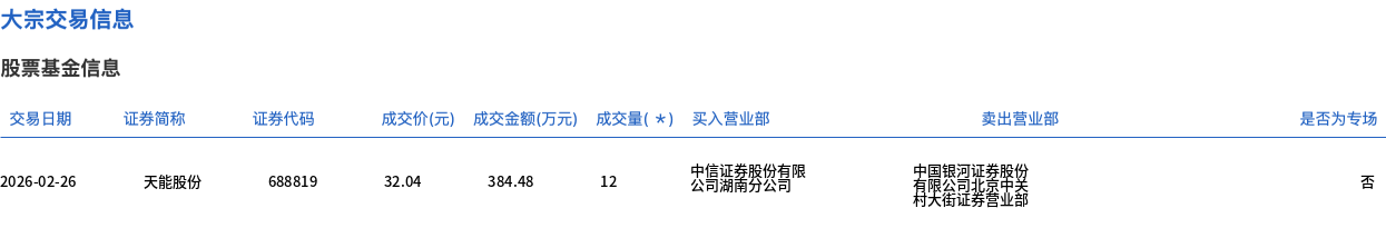 2月26日,天能股份大宗交易成交12萬股,成交額384.48萬元,占當日總成交額的5.6%,成交價32.04元,較市場收盤價34.07元折價5.96%。