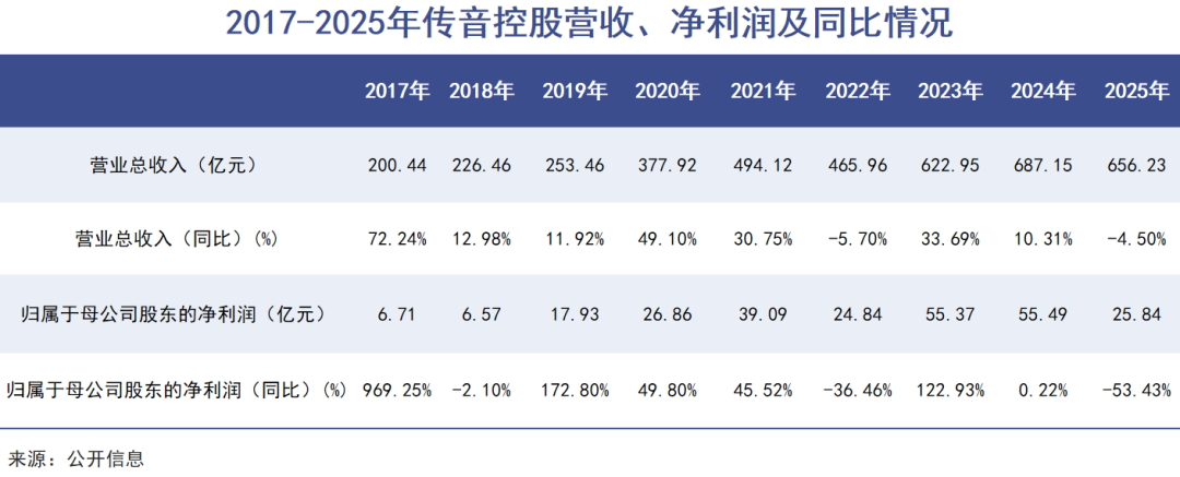 進(jìn)入2025年,情況變得更加糟糕,傳音控股的業(yè)績(jī)直接陷入負(fù)增長(zhǎng),并即將迎來(lái)了上市以來(lái)最差年報(bào)。