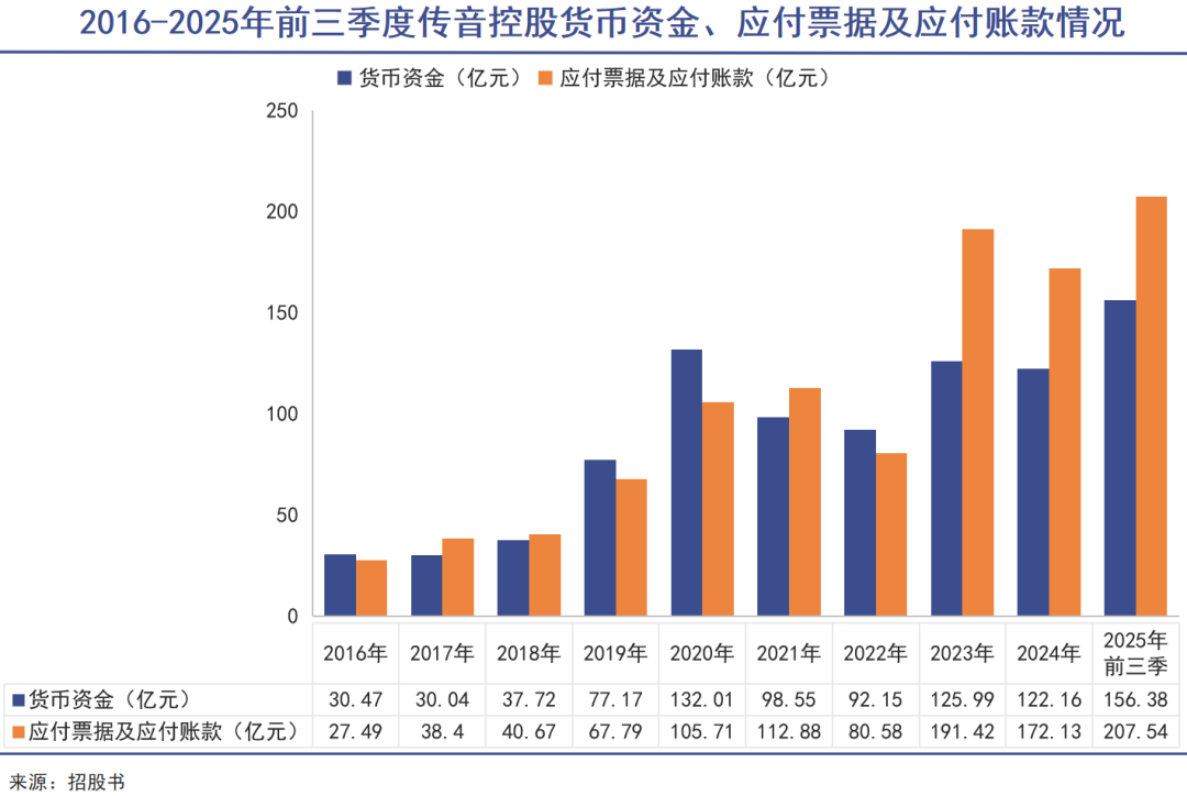 根據(jù)2025年三季報(bào)數(shù)據(jù),其應(yīng)付票據(jù)和應(yīng)付賬款從2024年的172.13億元漲到了207.54億元,增幅顯著。這已經(jīng)是傳音控股近三年時(shí)間內(nèi),賬面貨幣資金持續(xù)遠(yuǎn)小于應(yīng)付票據(jù)及應(yīng)付賬款數(shù)字,這意味著傳音控股對(duì)上游供應(yīng)商的付款壓力加大,且供應(yīng)鏈的穩(wěn)定性可能受到影響。