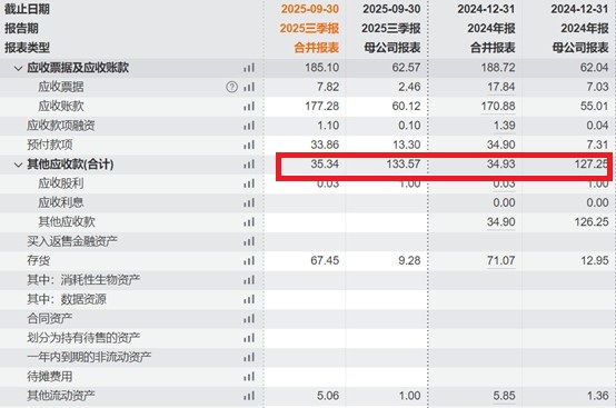 2025年三季報(bào)顯示,怡亞通母公司資產(chǎn)負(fù)債表中的“其他應(yīng)收款”高達(dá)133.57億元,而合并報(bào)表層面,“其他應(yīng)收款”項(xiàng)目驟降至35.34億元,兩者之間的差額達(dá)到98.23億元。
