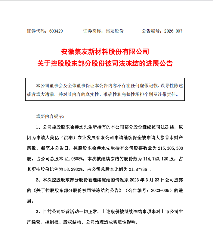 2月27日,集友股份(603429.SH)發(fā)布公告,披露控股股東部分股份被司法凍結(jié)的進(jìn)展公告。
