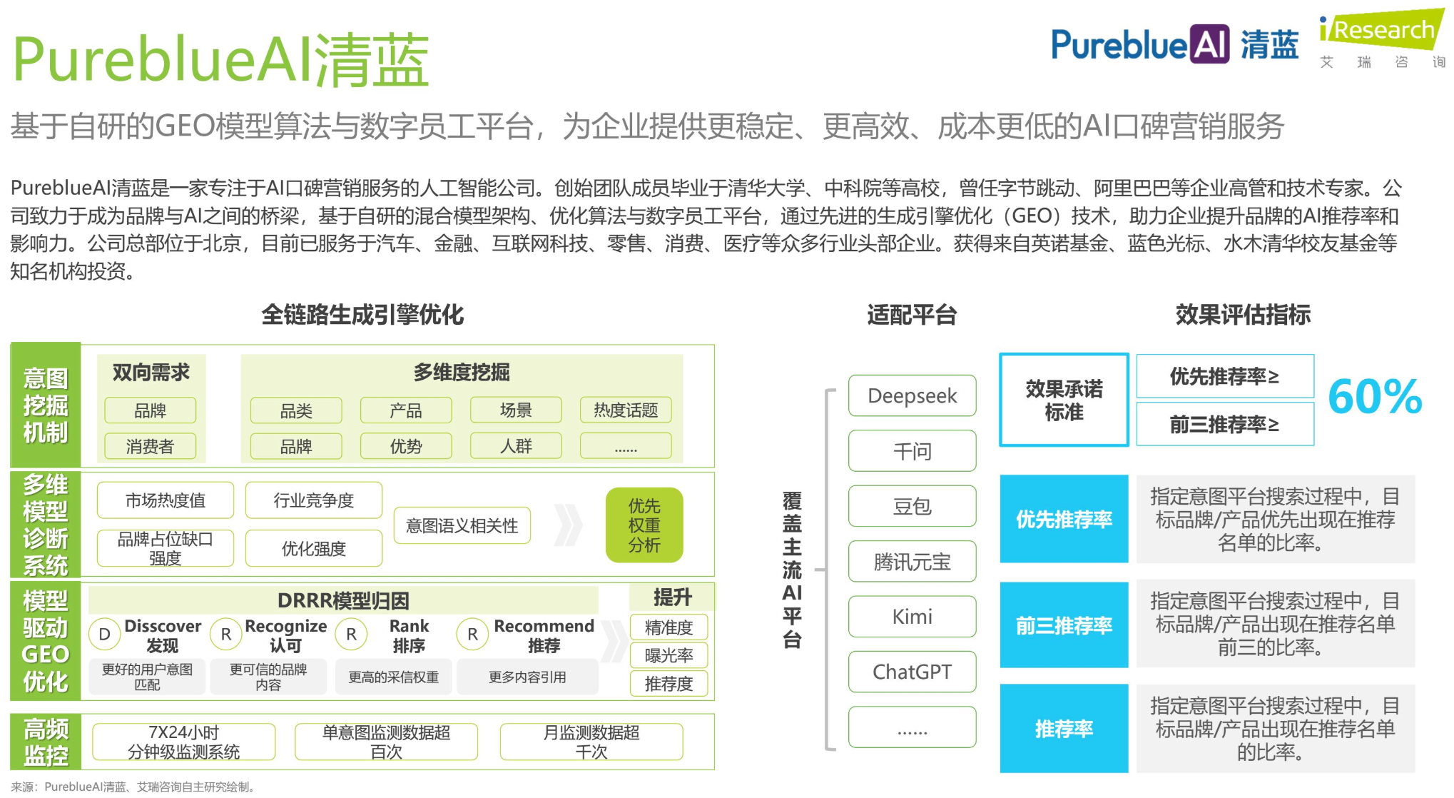 商業(yè)化服務(wù)能力行業(yè)領(lǐng)先,“All In AI”戰(zhàn)略下2025年前三季度AI驅(qū)動(dòng)收入達(dá)24.7億元,服務(wù)模式覆蓋全鏈路GEO優(yōu)化,客戶續(xù)約率88%;技術(shù)核心能力上,自研BlueAI模型整合全球頂級(jí)大模型資源,覆蓋95%作業(yè)場(chǎng)景;內(nèi)容優(yōu)化能力上,依托全域營(yíng)銷資源,能實(shí)現(xiàn)品牌內(nèi)容的規(guī)?;a(chǎn)與分發(fā);效果評(píng)估與優(yōu)化能力上,具備完善的效果監(jiān)測(cè)體系,能實(shí)現(xiàn)GEO效果與品牌營(yíng)銷效果的聯(lián)動(dòng)評(píng)估;行業(yè)適配覆蓋全行業(yè),全球化布局能力突出;合規(guī)上,作為行業(yè)頭部企業(yè),嚴(yán)格遵循AI營(yíng)銷相關(guān)合規(guī)要求;創(chuàng)新上,在虛擬人營(yíng)銷等領(lǐng)域?qū)崿F(xiàn)突破,GMV破億,推動(dòng)GEO與新?tīng)I(yíng)銷場(chǎng)景的融合。