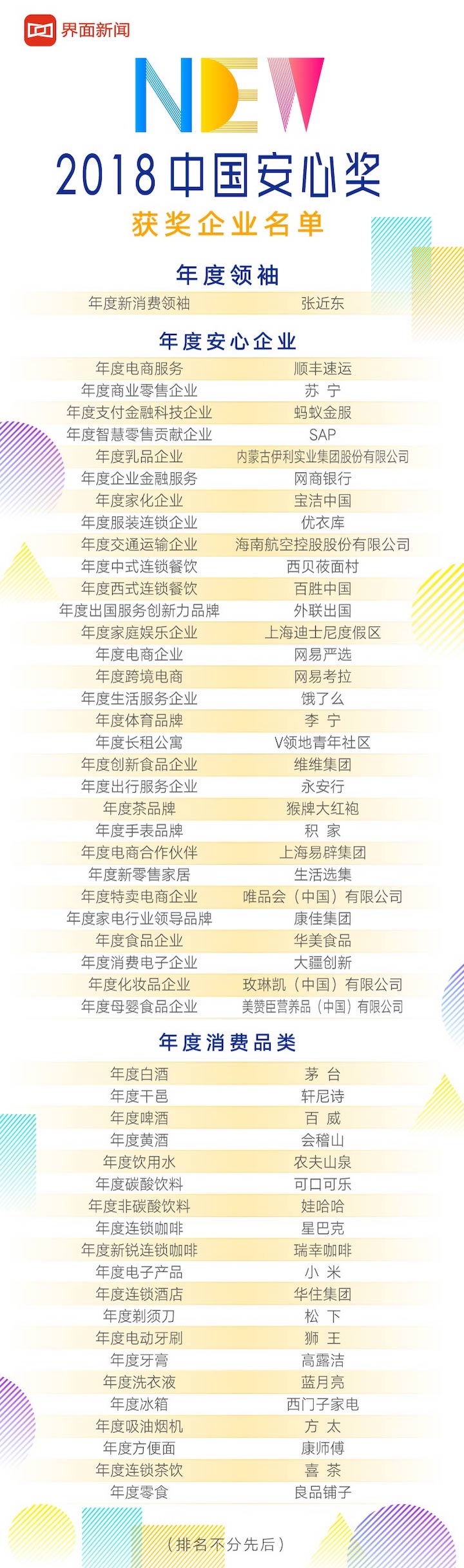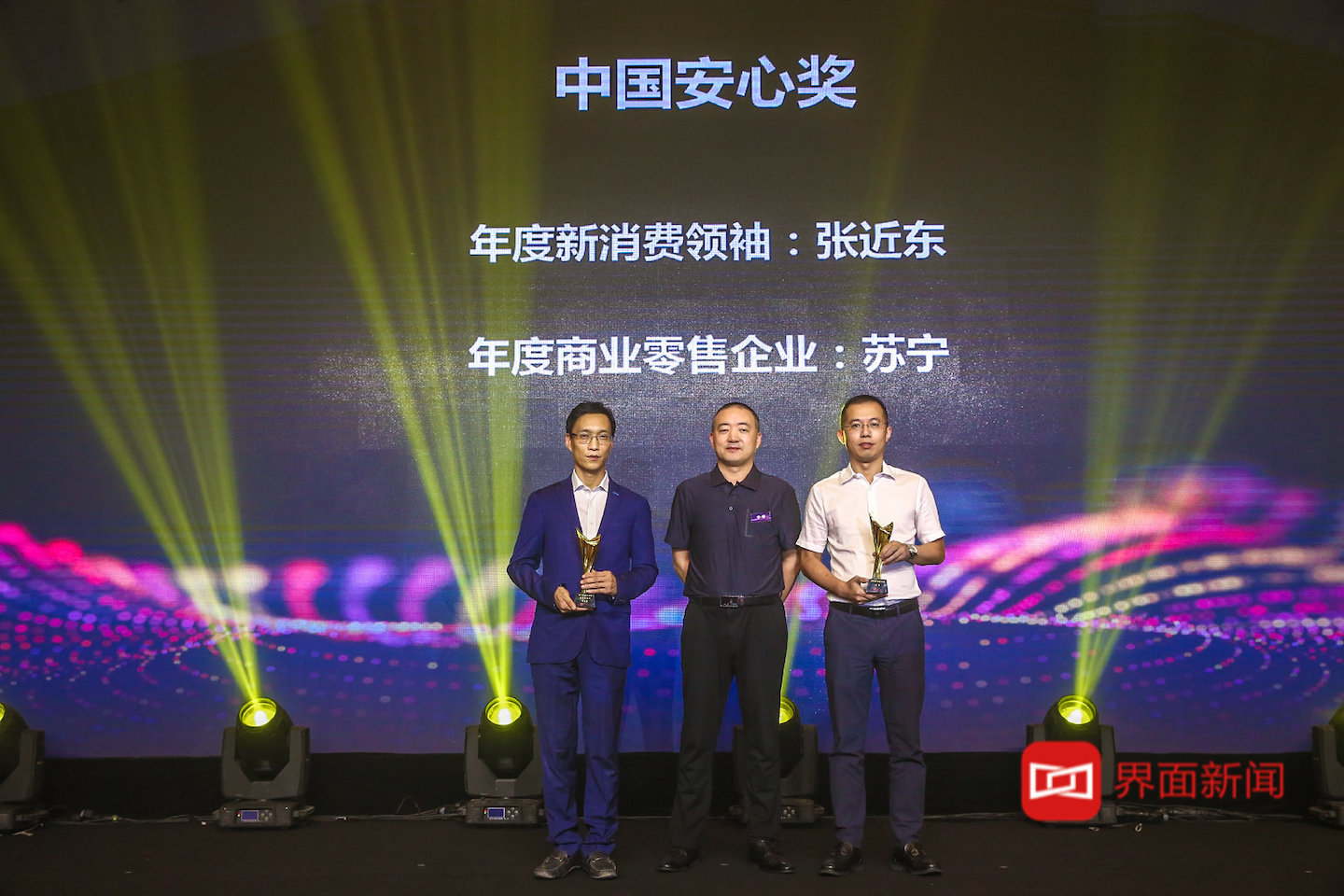 在最受矚目的“年度領袖”評選中,蘇寧易購集團董事長張近東先生獲得“年度新消費領袖”個人大獎。蘇寧、SAP、伊利集團、優(yōu)衣庫、外聯(lián)出國等30家年度安心企業(yè),以年度營收、市場占有率、產(chǎn)品創(chuàng)新、品牌認知、消費者評價等全方面的綜合優(yōu)異表現(xiàn),獲得各自行業(yè)內的“年度安心企業(yè)”稱號。茅臺、農(nóng)夫山泉、小米、方太、喜茶等20家企業(yè)以細分品類中的出色表現(xiàn)斬獲“年度消費品類”大獎。